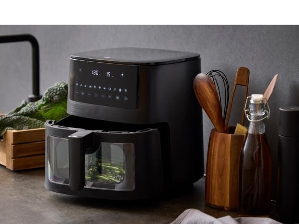 Airfryer 6,5 liter 1650 watt med vindue i skuffen, så du kan følge med i tilberedningsprocessen.